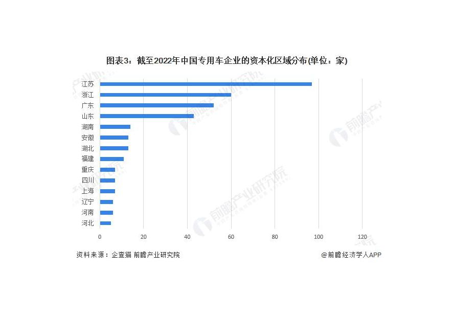根據中國企業數據庫企查貓,目前中國專用車資本化的企業 ( 有融資信息和上市信息 ) 的主要分布在江蘇。截至目前,江蘇省共有存續和在業的資本化企業共計 97 家,其次為浙江的 60 家。