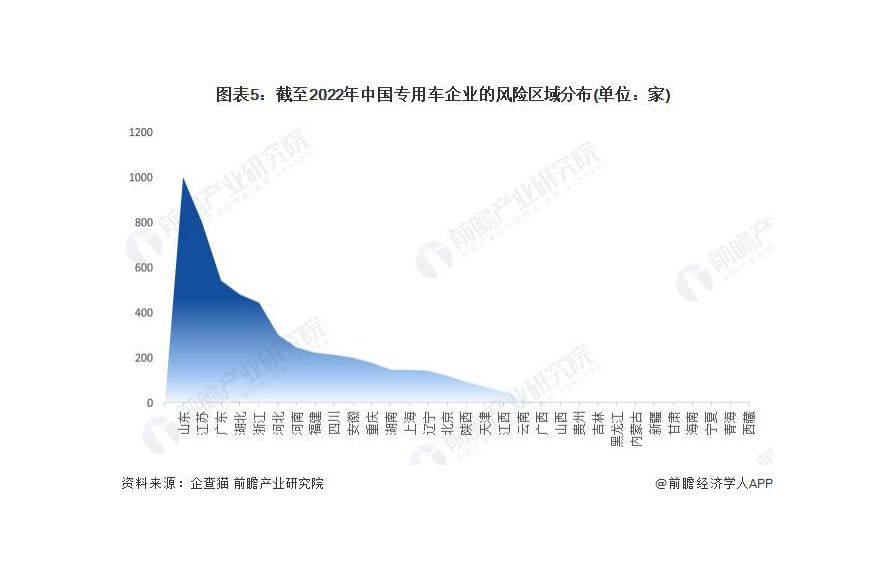 根據中國企業數據庫企查貓,目前中國專用車有相關風險信息的企業主要分布在山東省和江蘇省等地。截至目前,江蘇省共有 1001 家企業涉及風險相關信息,而江蘇則有 799 家企業涉及風險相關信息。